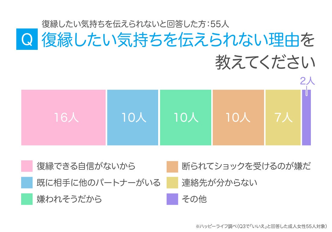 「いいえ」と回答した55人に対して、復縁したい気持ちを伝えられない理由を聞いてみたところ、「復縁できる自信がないから」と回答した人が最多でした。