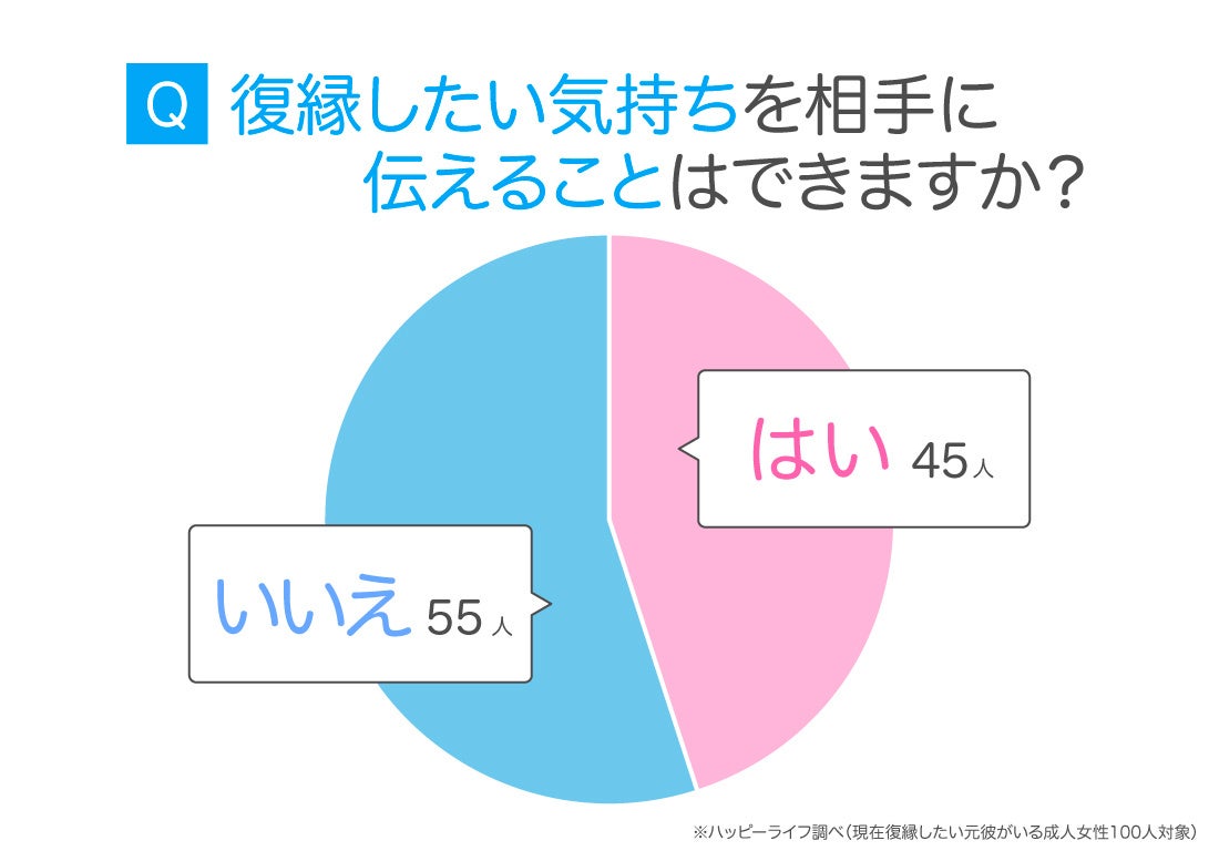 「はい」と回答した人は45人で大差はありませんでしたが、自分から相手に復縁したい気持ちを伝えられない人が多いようです。