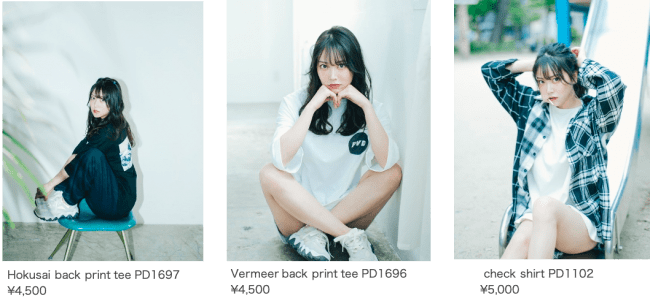 pivot door× NMB48のコラボシリーズ第一弾として今年5月には、「みるるん」の愛称でお馴染みの白間美瑠さんをメインモデルに起用いたしました。葛飾北斎やフェルメールの名画がバックに大胆にプリントされたデザインのオリジナルアートTシャツやロンT、パーカーなどストリートムードたっぷりに着こなしています。