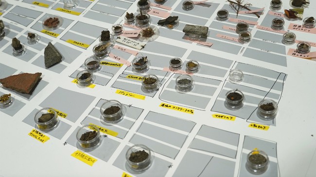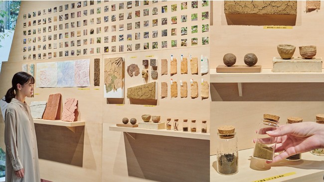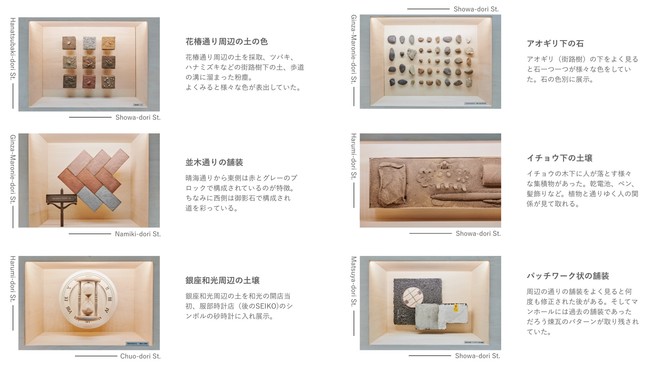展示の背面ではプロセスや銀座の土や石で作った陶器(銀座焼き)や泥団子、土で染めた泥染などを展示