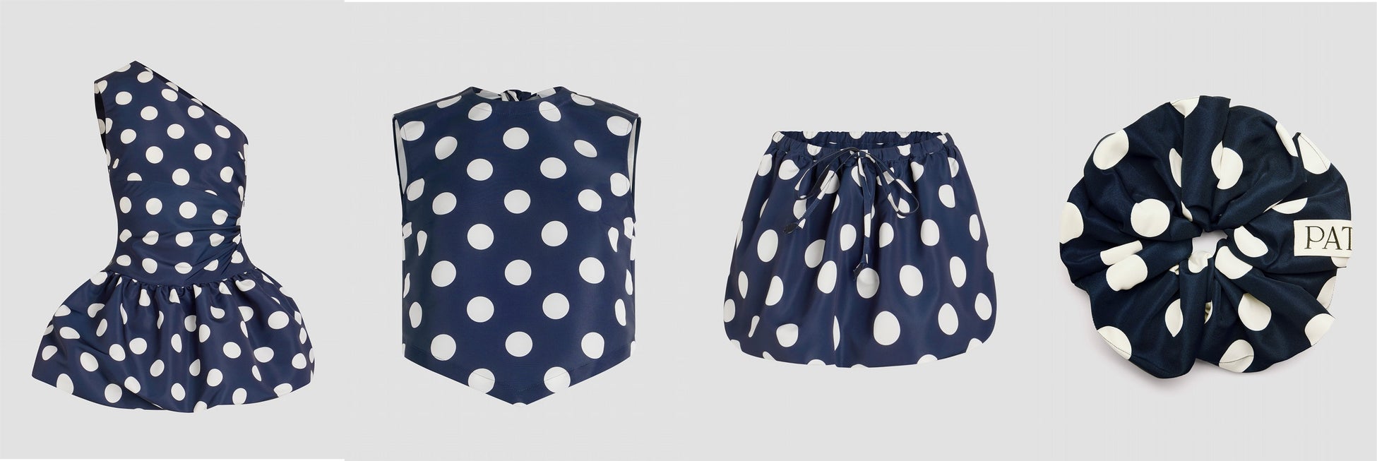 エレガントで華やかなドット柄。ローズのシルエットにインスピレーションを得たドレスをはじめ、トップスやスカートをご紹介。またコーディネートのアクセントとなる大きなシュシュもラインアップ。すべてのアイテムはリサイクルオットマンファイユを使用し、サステナブルなものづくりを実現しています。