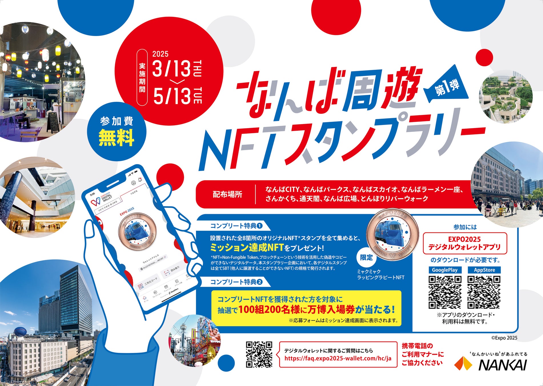 株式会社HashPort(代表取締役CEO:吉田世博、以下「HashPort」)は、南海電気鉄道株式会社(社長:岡嶋信行、以下「南海電鉄」)と連携し、「EXPO2025デジタルウォレット」の事業連携サービスの一つとして、万博開幕1カ月前の3月13日(木)から開催期間中の5月13日(火)まで、第1弾「なんば周遊NFTスタンプラリー」を実施します。