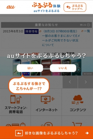 スマホに表示したお好きな画像、auサイトの画面がスマホを振ることでぷるぷるします。
