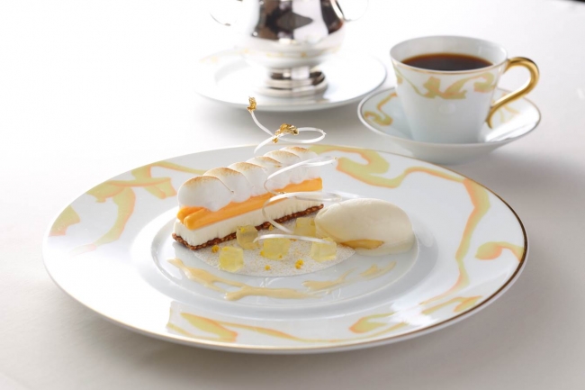 フロマージュブランのムースとクレームシトロンを組み合わせたタルトに、レモン風味のショコラブランソルベと ゼリーを添えた初夏らしい爽やかなデザートです。
