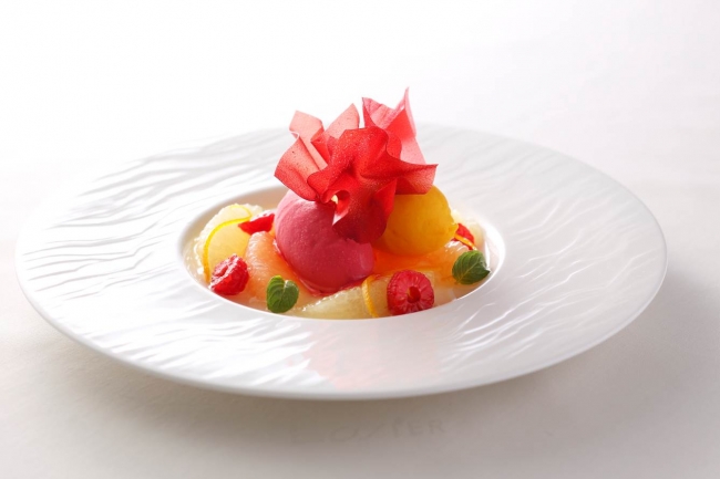母の日のカーネーションをイメージしたチュイールを印象的に盛り付けました。マンゴー、フランボワーズのソルベや爽やかな果実で彩ったグレープフルーツのコンポートは、さっぱりとした味わいです。グロゼイユ、フランボワーズで仕立てたチュイールのパリパリした食感と共にお楽しみください。