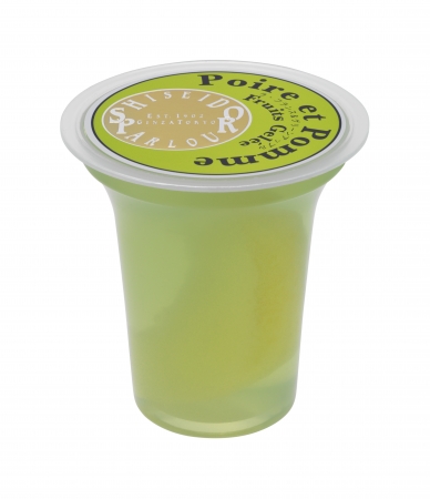芳醇な香りの山形県産ラ・フランスの果肉を、ほろっと繊細な口どけでさわやかな風味の青森県産青りんご・王林果汁のゼリーで閉じ込めました。