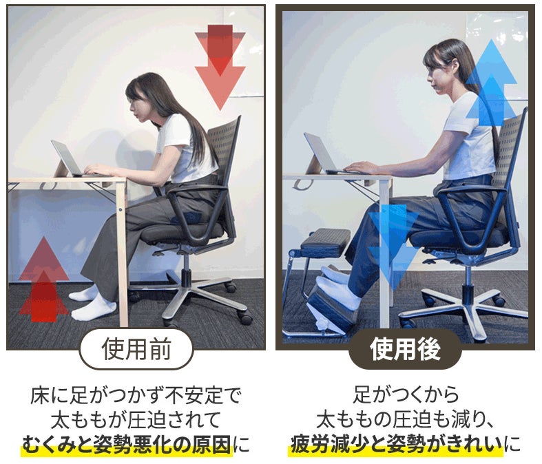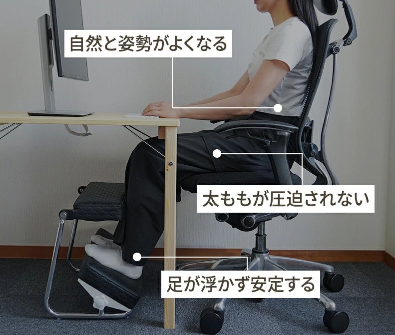 自分に合った角度や高さのフットレストで正しい姿勢を確保することで、長時間のデスクワークでも体への負担を軽減します。