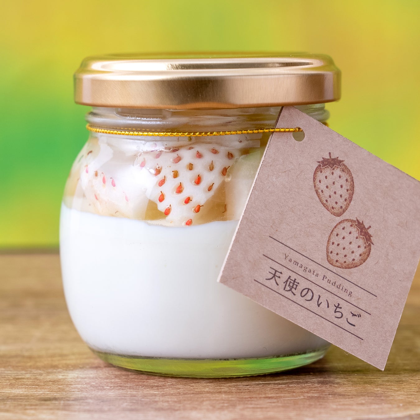 雪国山形の豊かな大自然でのびのび育った乳牛から搾った「やまべ牛乳」。その濃厚なミルクで作られた、とろけるようなミルクプリンに、山形県東根市産の希少な白いちごを贅沢に使用したプリン。さらに、白いちごの甘酸っぱさを凝縮したジュレをトッピング。プリンとジュレが織りなす、白いちごの雪景色のような、見た目も美しいプリンです。