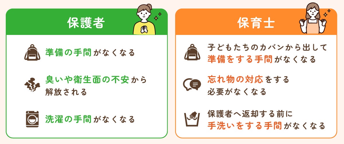 本サービスを利用することで、保護者は「食事用エプロンや手口ふきの持参・洗濯する手間」をなくすことができ、さらに保育士は「準備や片付けの手間」「保護者への返却ミス」をなくすことができます。