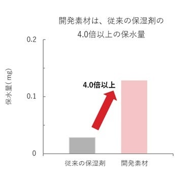 本研究では、セラメーラと抱水剤との組み合わせによる「洗浄後の保湿作用の高さ」を調査。数ある化粧品原料の中から、セラメーラとマルチトールの組み合わせが優れた保湿効果を有することが明らかになりました。角層を用いた洗浄実験にて評価した結果、セラメーラとマルチトールの混合(独自開発)では、水分保持量が、従来の保湿剤*と比較して 4.0倍以上に高まることが判明しました(図1)。また、セラメーラ単体と比較しても、優れた保湿効果があることを確認しました。