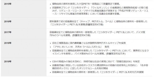 アサヒ飲料ではお客様の環境問題への意識が高まる中、2015年より環境負荷低減への取り組みとして植物由来原料を使用した「三ツ矢サイダー」PET1.5Lを数量限定で発売してきました。