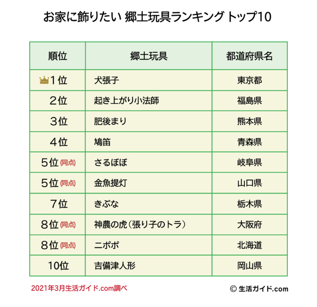 株式会社ウェイブダッシュ(本社:東京都千代田区、代表取締役社長 河野 由紀)が運営する、みんなでつくる地域応援サイト「生活ガイド.com」(https://www.seikatsu-guide.com/) は、みんなのランキング第24回「お家に飾りたい 郷土玩具ランキング」のトップ10を発表いたしました。