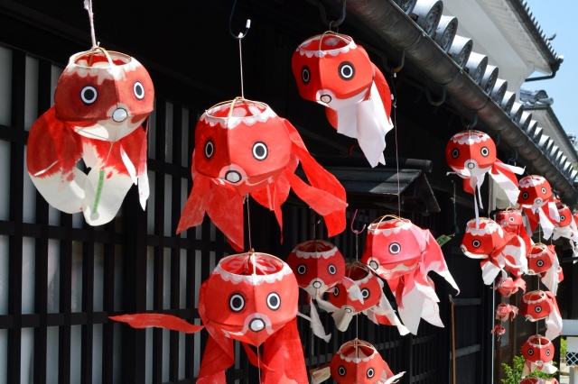 およそ150年前に、商人が伝統織物「柳井縞」の染料を用いて作ったのがきっかけです。今では夏になると、紅白の体に黒い目をパチっと開いた「金魚提灯」が軒先に吊るされ、「白壁の町並み」に彩りを添えています。青い空には金魚が良く映えるので、風鈴と一緒に飾るとお家でも旅行気分を楽しめそうです。