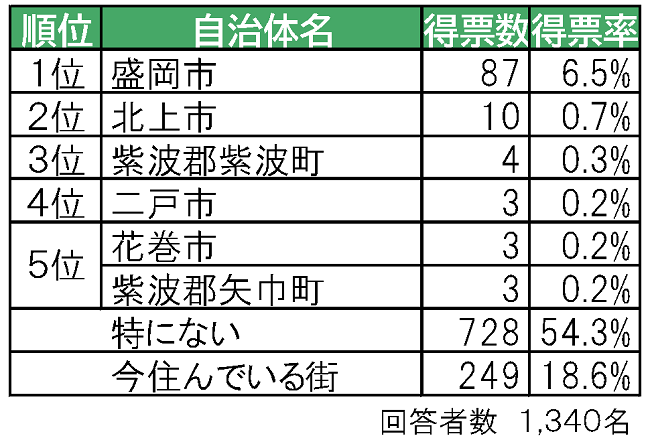 盛岡市が得票率6.5%と圧倒的支持を受け、2位は住みここち5位の北上市が、3位には住みここち2位の紫波町がランクインしています。
