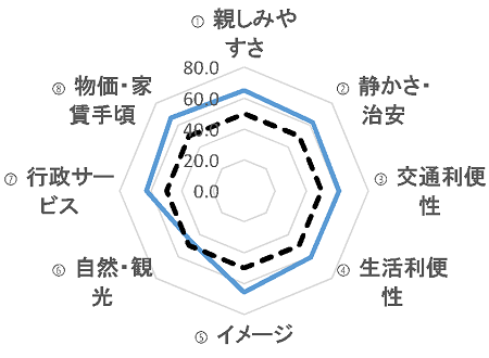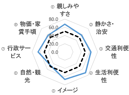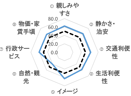 「住みここちに関する54項目の設問」の因子分析から得られた8つの要素をレーダーチャートにすると、その自治体のイメージが把握できます。基準点(下図点線)よりもどの項目が大きく広がっているかで特徴がわかります。