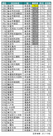 ・宮城県からは18自治体が上位50にランクイン。うち、東松島市以外の17自治体が仙台都市圏。