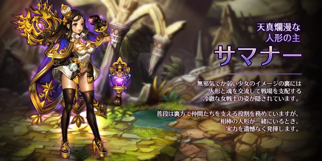今回のアップデートにより、新たなるプレイヤーキャラクター「サマナー」が追加されます。「サマナー」は人形を召喚し相手を攻撃いたします。人形を召喚している間は仲間の能力を上昇させることができ、戦いを有利に進めることができます。また、通常攻撃の際に自身のアクティブクールタイムが短縮されますので技の出が早くなります。主に仲間のサポート役ですがその他にも強力なスキルもございますのでぜひプレイしてみてください。