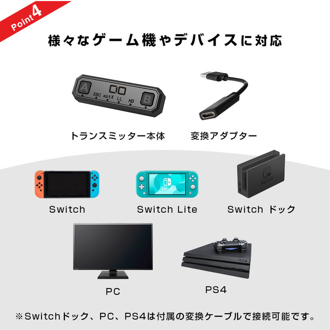 「株式会社CIOとは『BT-TM800』『BT-TM700』は家庭用ゲーム機やPCなどの音声をお手軽・簡単にワイヤレス化することが可能なオーディオトランスミッターです。本製品を使用することでワイヤレス接続が可能になり、有線コードから解放され没入感のあるプレイが可能となります。