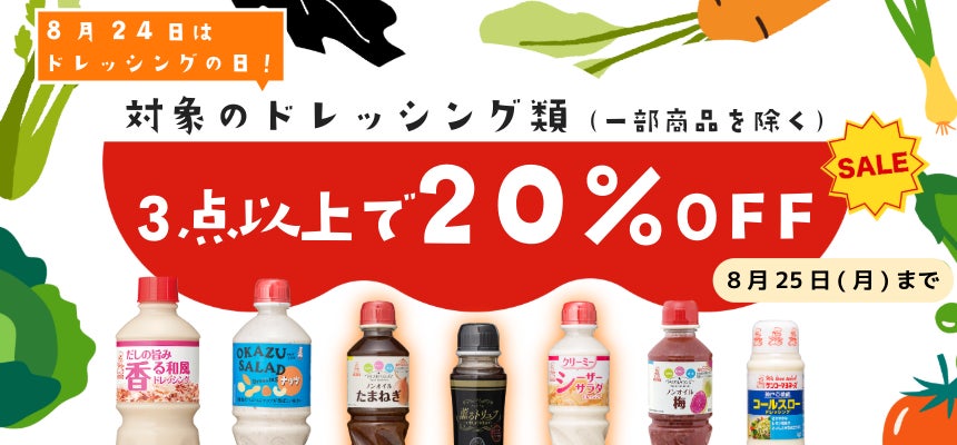 当社が制定した8月24日のドレッシングの日を記念して、本日8月18日(月)から8月25日(月)までの8日間限定で、対象のドレッシング類を3点以上ご購入すると20%OFFになるセールを開催。話題の新商品もお得に試せる特別な機会です。ぜひご利用ください。