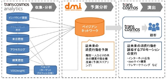 トランスコスモス・アナリティクスが持つビッグデータ分析のノウハウと、dmiが持つ過去から未来を予測できる解析技術「ベイジアンネットワーク」による予測技術を融合し、顧客と企業のマーケティングプロモーションの効率化を支援します。