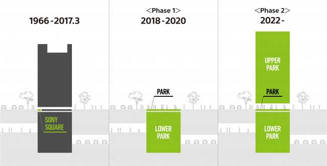 1966年から続いた旧ソニービルを、2つのフェーズを経てリニューアルするプロジェクトです。第1フェーズでは、設立当初から「銀座の庭」として続いた、ソニービル入り口横の公共スペース(ソニースクエア)をさらに拡大し、2020年秋までの期間限定で「Ginza Sony Park」を開園。第2フェーズとして、2022年にGinza Sony Parkのパークのコンセプトを上層階にも下層階にも通底させた新しい概念の新ソニービルを竣工する予定です。