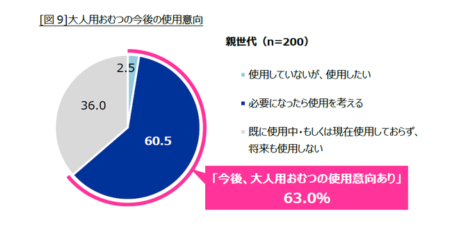 親世代に大人用おむつの使用状況と今後の使用について聞くと、「使用意向あり」と回答した人(「使用していないが、使用したい」(2.5%)、「使用していないが、必要になったら考える」(60.5%)の合計)63.0%は、今後、大人用おむつの使用意向があることが明らかになりました。
