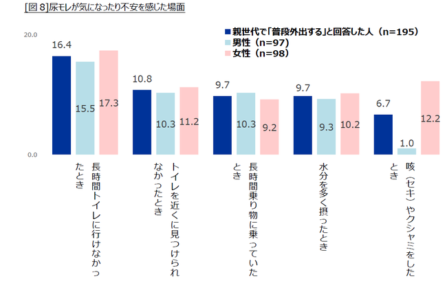 尿モレの不安を感じた場面については、「長時間トイレに行けなかったとき」(16.4%)、「トイレを近くに見つけられなかったとき」(10.8%)と、物理的にトイレに行けなかった場面で不安を感じたという回答が多く得られました。 [図8]。