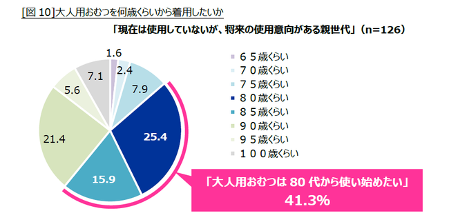 親世代に大人用おむつを何歳くらいから使い始めたいかを聞いたところ、「80歳くらい」(25.4%)、が最も多く、「85歳くらい」(15.9%)と合わせて41.3%となり、80代くらいで使用を開始したいと考えている人が多いことがわかりました。また、「80代以上」と回答した人の合計は、75.4%となりました[図10]。