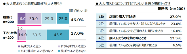 一方、子ども世代は「恥ずかしいと思わない」(43.5%)、「あまり恥ずかしいと思わない」(39.5%)の合計は83.0%と、大多数の人は「大人用おむつの着用は恥ずかしくない」と考えていることが明らかになりました。