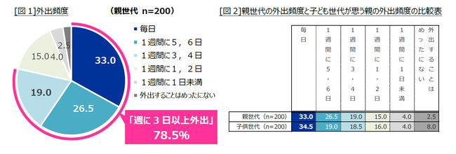 親世代と同居している子ども世代にも「親世代がどのくらいの頻度で外出していると 思うか」について聞いたところ、「週に3日以上」との回答は72.0%(※2)となり、やや親世代の実際の外出頻度が高いものの、大きなギャップはなく、子ども世代も親世代のアクティブな外出を把握しているようです[図2]。
