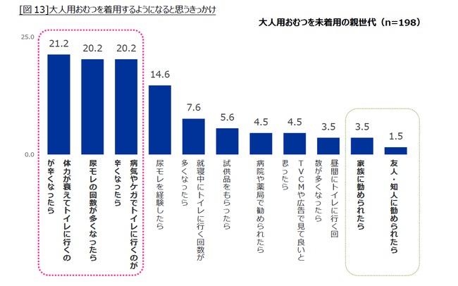 大人用おむつを未着用の人に、着用するようになると思うきっかけを聞いたところ、「体力が衰えてトイレに行くのが辛くなったら」(21.2%)、「尿モレの回数が多くなったら」(20.2%)、「病気やケガでトイレに行くのが辛くなったら」(20.2%)が上位3つで、それぞれ2割を超える人が回答しました。「生活の中で必要に迫られたら」と考える人が多いようです。