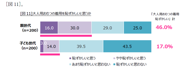 60歳以上を「親世代」、30~59歳の人を「子ども世代」として、「大人用おむつの着用を恥ずかしいと思うか」を聞いたところ、親世代では46.0%と半数近い人が「恥ずかしい」と感じていることがわかりました。
