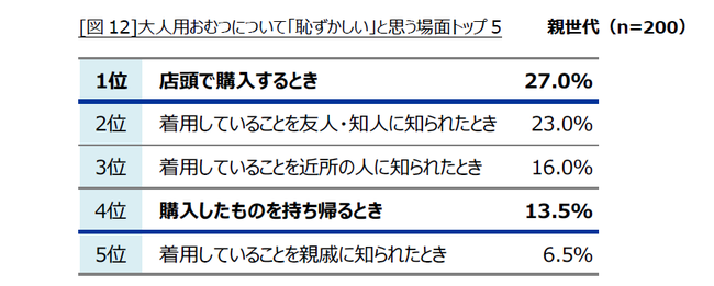 親世代にとっては、大人用おむつ着用において「購入時」と「人に知られること」を恥ずかしいと感じる人が多く、ネックとなっている様子がわかる結果となりました[図12]。
