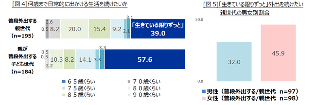 「何歳まで日常的に出かける生活を続けたいか(親世代)/続けてほしいか(子ども世代)」では、「生きている限りずっと」が親世代(39.0%)・子ども世代(57.6%)の両方で1位となりました。特に子ども世代は6割近くが親にずっと元気で外出してほしいと願っています。親世代で「80歳くらい」以上と回答した人は88.8%(※1)で、人生100年時代といわれる現代、「健康寿命も長く」という考えがスタンダードといえる結果となりました[図4]。
