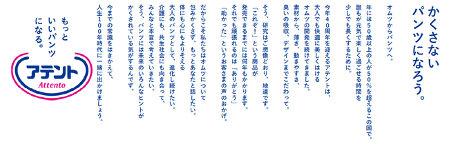 アテントは、この地域共生社会の理念に共感し、今後世代を超えて大切な問題となる「介護の社会化」に取り組みます。そして、お客様一人ひとりにとって、自分自身の問題だと捉えてもらいたいと願っています。そのために、大人用紙おむつを下着の総称である「パンツ」と呼び、「かくさないパンツ」をコミュニケーションワードとして、おむつを恥ずかしいものとして隠すのではなく、オープンにしてみんなで考えていけるポジティブなものに変えていきたいと考えています。
