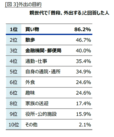 また、後述の調査結果より、親世代の外出理由の1位が「買い物」で約9割の人が回答していることから、7月より開始されたレジ袋有料化に伴うエコバッグ需要の高まりは、親世代にも当てはまることがわかりました。