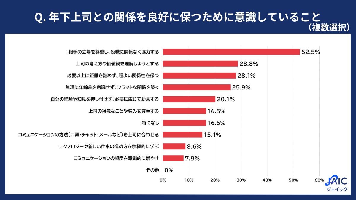 「年下の上司がいる」と回答した方に、「年下上司との関係を良好に保つために意識していることを教えてください」と複数選択で質問したところ、「相手の立場を尊重し、役職に関係なく協力する」が52.5%、「上司の考え方や価値観を理解しようとする」が28.8%、「必要以上に距離を詰めず、程よい関係性を保つ」が28.1%、「無理に年齢差を意識せず、フラットな関係を築く」が25.9%、「自分の経験や知見を押し付けず、必要に応じて助言する」が20.1%、「上司の得意なことや強みを尊重する」「特になし」がそれぞれ16.5%、「コミュニケーションの頻度を意識的に増やす」が15.1%、「テクノロジーや新しい仕事の進め方を積極的に学ぶ」が8.6%、「コミュニケーションの方法(口頭・チャット・メールなど)を上司に合わせる」が7.9%、「その他」が0%となりました。