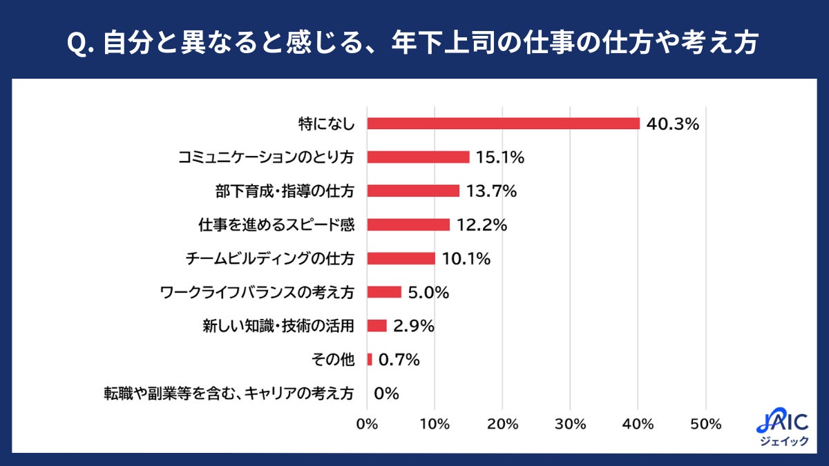 「直属の上司は年下」と回答した方に、「自分と異なると感じる、年下上司の仕事の仕方や考え方として、もっともあてはまるものをひとつ教えてください」と質問したところ、「特になし」と答えた方が40.3%と最も多い結果となり、続いて、「コミュニケーションのとり方」が15.1%、「部下育成・指導の仕方」が13.7%、「仕事を進めるスピード感」が12.2%、「チームビルディングの仕方」が10.1%、「ワークライフバランスの考え方」が5.0%、「新しい知識・技術の活用」が2.9%、「その他」が0.7%、「転職や副業等を含む、キャリアの考え方」が0%となり、約6割の方が、年下上司と仕事の仕方や考え方について、自分との何らかの違いを感じていることがわかりました。