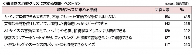 「書類/紙の資料を収納する商品に、どのような機能(特長)があれば良いか」を聞いたところ、「カバンに常備できる大きさで、不意にもらった書類の保管にも困らない」(48.5%)、「丈夫な素材を使用していて、収納した書類をしっかりガードできる」(35.5%)でした。