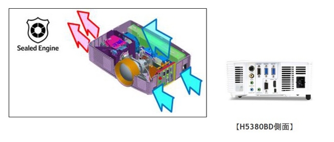 - プロジェクター内で埃に弱いパーツ部位には、ダストシールドを設けて密閉率を高めています。また吸気・排気のエアフロー効率も高いため、長時間の使用による熱問題にも安心な設計になっています。