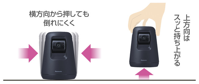 いつでもスマートフォンから見守りができるのは安心ですが、もし万が一ペットカメラが倒れてしまって映像が何も見えなかったらとても不安ですよね。今回の新製品はペットにいたずらされても倒れにくい「転倒防止構造」を採用しています。カメラ本体が横方向から押されると通気口をふさいで密閉し設置面に吸着する特殊構造になっています。垂直に持ち上げると通気口が開いて密閉が解除され簡単に動かすことができるので、お掃除もラクラクです。