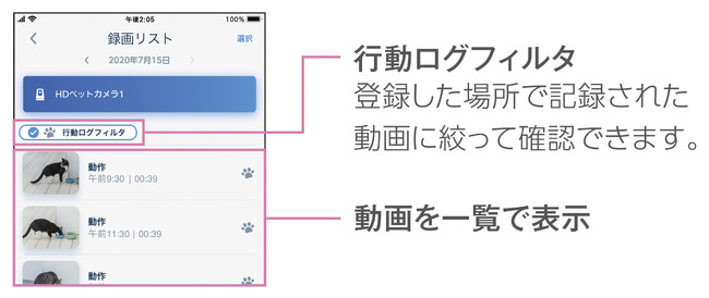 KX-HDN215はペットの特定行動を簡単に見られる「行動ログ」機能を搭載しています。専用アプリ内の「行動ログ」で登録した範囲内にペットが一定時間立ち寄った映像を見たい時に簡単に確認することができます。