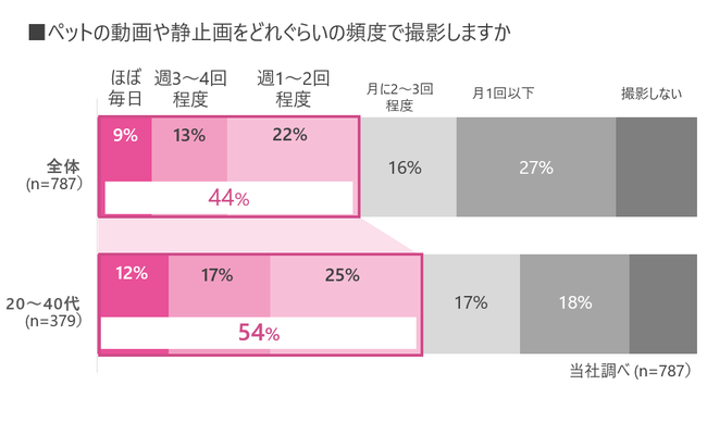 ペットの動画や静止画をどれくらいの頻度で撮影しますか。という質問には全体では44%の方が、20代~40代では54%の方が週1~2回以上ペットの写真や動画を撮影していることがわかりました。