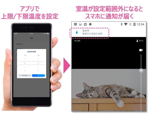 ペットがいる室内の温度も心配ですよね。HDペットカメラは温度センサーを搭載。外出先からいつでも室温を確認できるうえ、カメラの温度が設定範囲を超えた場合にスマートフォンに通知されるので、温度の変化に気づくことができます。