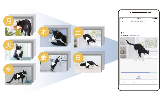 さらに撮りためた動画を気軽にスマートフォンで楽しめる「一週間ダイジェスト」機能を搭載。1日1動画を自動でランダムに選んで先頭の5秒間をつないで再生するので、普段見ることができない様々なペットの様子をダイジェスト動画で確認することができます。意外な行動を発見できるかもしれません。
