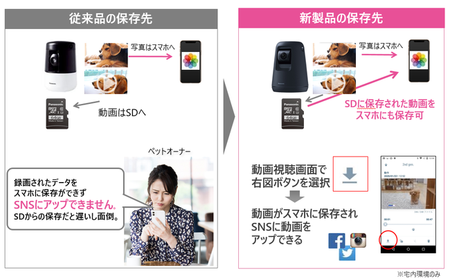 KX-HDN215は静止画はもちろん、宅内環境であれば動画を直接スマートフォンに取り込むことができます。簡単に写真や動画をスマートフォンに保存できるので、SNSへのアップも手軽にできそうです。