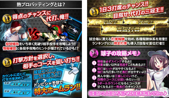 「熱プロバッティング」は、代打として1日3回挑戦できる一打席勝負のイベントです。相手の投球傾向を見破り、打撃方針と打法を選択、コースを読んで相手投手を攻略しましょう。