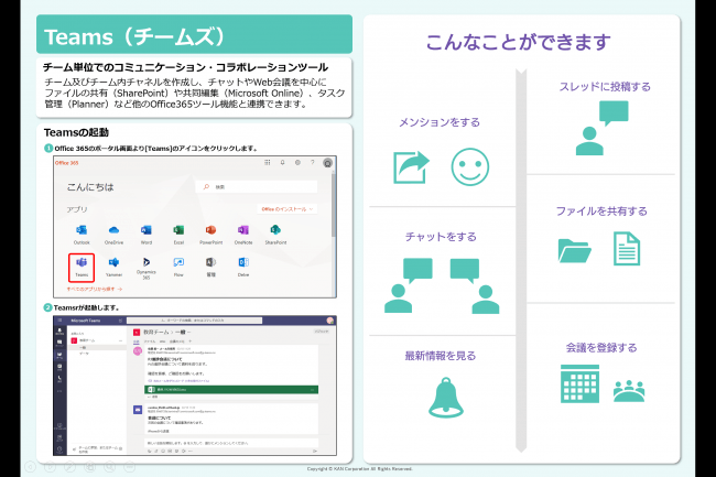ナレッジマニュアルは、 Microsoft Office 365 の操作方法だけでなく、Office 365 を活用した働き方改革、コミュニケーション改革を推進する企業様の導入・運用時の課題を解決が可能な教育コンテンツです。