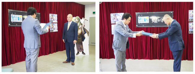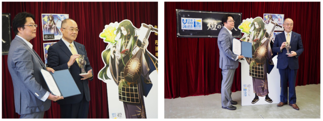 1.「燈の守り人」キャラクター贈呈 2.フォトセッション(キャラクターの等身大パネルを挟んで記念撮影) 3.会談(中山泰 京丹後市長・燈の守り人製作委員会プロデューサー 柴田英知) 4.囲み取材 |
