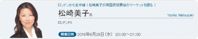 【内容】6月のセミナーは欧州市場のスペシャリスト!「ロンドンFX」でおなじみの松崎美子さんが登場!なんと今回は、英国民投票が行われた現地ロンドンより生中継でお話ししていただきます。